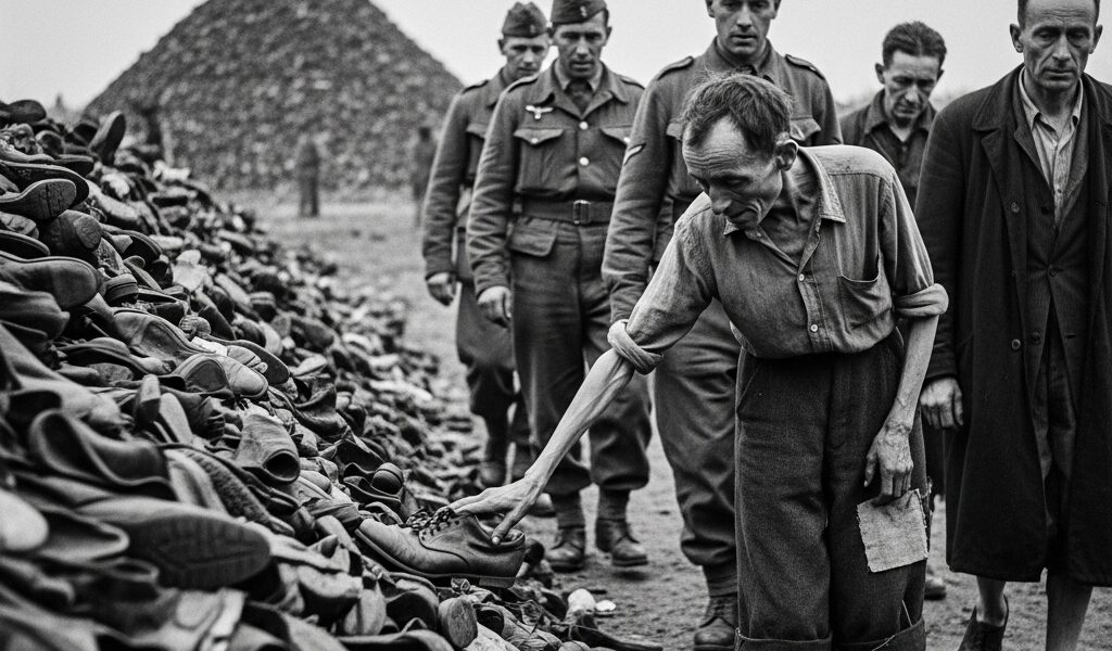 Il momento immortale in cui un sopravvissuto tocca una scarpa con la punta delle dita in mezzo a un mucchio infinito ci racconta più di mille storie. L’uomo, a piedi nudi, con lo sguardo abbassato, avanza tra le tracce tangibili degli assenti. Intorno a lui, i soldati alleati osservano, impotenti di fronte a questa scena che sfida la comprensione. Non ci sono parole sufficienti per descrivere l’abisso di dolore che emana da questo gesto: toccare una scarpa è salutare un’anima scomparsa, riconoscere l’esistenza di un essere umano cancellato dal mondo, ma la cui memoria resiste all’oblio.