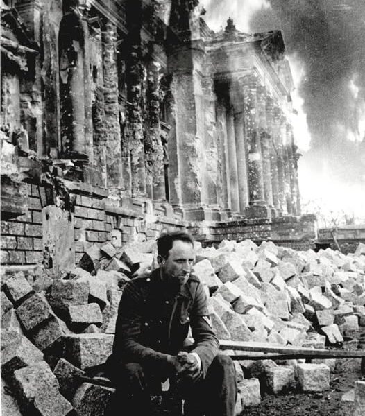 Das Bild des einsamen Soldaten vor den brennenden Mauern des Reichstags spiegelt genau diese Situation wider. Er wirkt verloren, fast schon resigniert. Der Körper ist da, aber der Geist scheint ermüdet, ausgelaugt. Man spürt förmlich die Schwere der letzten Tage, das Bewusstsein, dass alles, wofür gekämpft wurde, in Rauch aufgeht. Der Reichstag hinter ihm, einst stolzes Bauwerk, liegt in Trümmern – ein Symbol für den völligen Zusammenbruch des „Tausendjährigen Reiches“, das gerade einmal zwölf Jahre bestand.