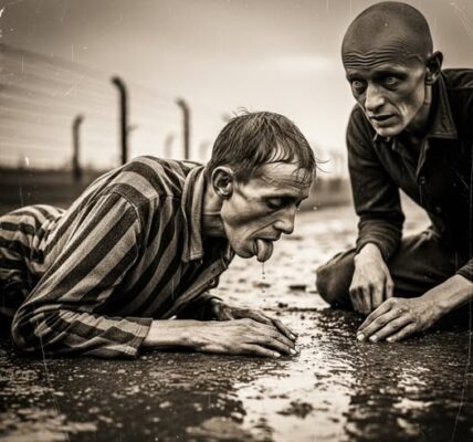 As the weeks passed, hunger only deepened the prisoners’ shadow. Faces sank into darkness, voices weakened, bodies collapsed in the mud of endless roll calls. But each night, despite exhaustion, the man repeated his gesture. His bony fingers tore open the portion, his eyes closed for a moment, and the fragment returned to its hiding place. In this way, night after night, he wove an invisible thread between himself and the child he hoped to hold again.