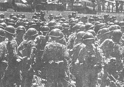 Sinh viên trường Cao đẳng Giao thông Vận tải cầm súng, gậy… tham gia một lớp học ngoài trời ngày 22/11/1967, sau khi toàn bộ ngôi trường được sơ tán gần Hà Nội.