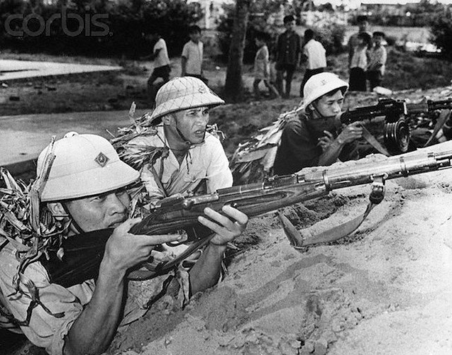 Những đứa trẻ chơi đùa bên cạnh nơi lực lượng dân quân tự vệ đang tập luyện ở Hà Nội ngày 16/7/1965. Ảnh của nhiếp ảnh gia Bettmann.