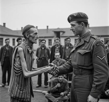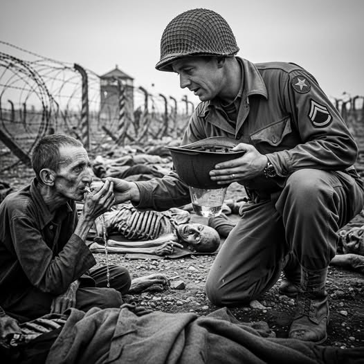 Official documents recount the liberation of Dachau in numbers: 32,000 prisoners freed, thousands piled up dead, stunned soldiers. Yet history is not transmitted in columns of statistics. It resides in tiny, almost invisible gestures. Like the water poured into a helmet, that tenuous thread between a world of darkness and a return to light. Some survivors whisper that through this gesture, they understood they were not ghosts, but men. But others add, in low voices, that they saw this soldier holding back his tears, as if he had recognized something familiar in the dying man’s gaze.