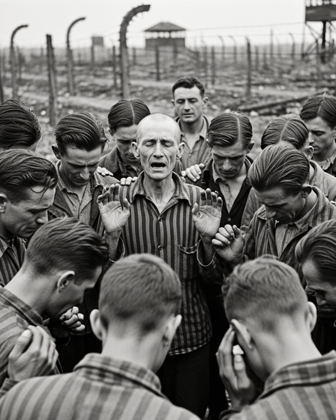 Doch als die Befreiung kam, geschah etwas Außergewöhnliches. Inmitten des Chaos, als Retter, Sanitäter und Befreier durch das Lager strömten, versammelte sich eine Gruppe Überlebender. Ihre gestreiften Uniformen klebten noch an ihren abgemagerten Körpern, ihre Gesichter waren vom Hunger gezeichnet, aber ihre Stimmen besaßen etwas Unzerstörbares. Zum ersten Mal seit Jahren, ohne Furcht vor den SS-Wachen, hob ein Mann die Hände und begann zu beten. Seine Stimme brach, zunächst unsicher, als wäre er die Freiheit nicht gewohnt. Doch die Worte kehrten zurück, alt und fest. Andere senkten die Köpfe. Manche falteten die Hände. Viele weinten offen. Das Gebet galt nicht nur den Toten – obwohl die Toten überall lagen, in Haufen, denen sich die alliierten Soldaten stellen mussten –, sondern auch den Lebenden.