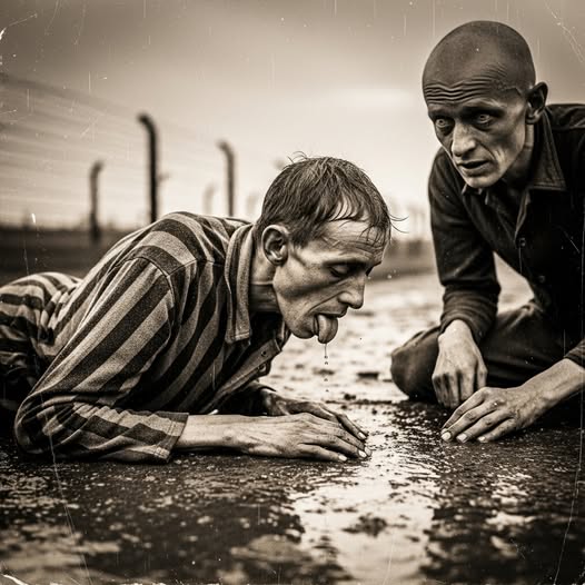 Der Mann lag am Boden, sein Körper so abgemagert, dass seine Knochen jeden Moment durch die Haut brechen konnten. Seine trockenen Lippen zitterten, und seine Zunge streckte sich nach der feuchten Erde. Er leckte den Regen auf wie ein Kind, das sich über einen Brunnen beugt, doch mit fast animalischem Eifer. Neben ihm beobachtete ihn ein anderer Gefangener, hin- und hergerissen zwischen Furcht und stillem Mitleid. „Es schmeckt sauber“, murmelte der Mann am Boden, als sei dieses Wasser, selbst vermischt mit dem Dreck des Lagers, der endgültige Beweis dafür, dass das Leben hinter dem Stacheldraht nicht gänzlich erloschen war.