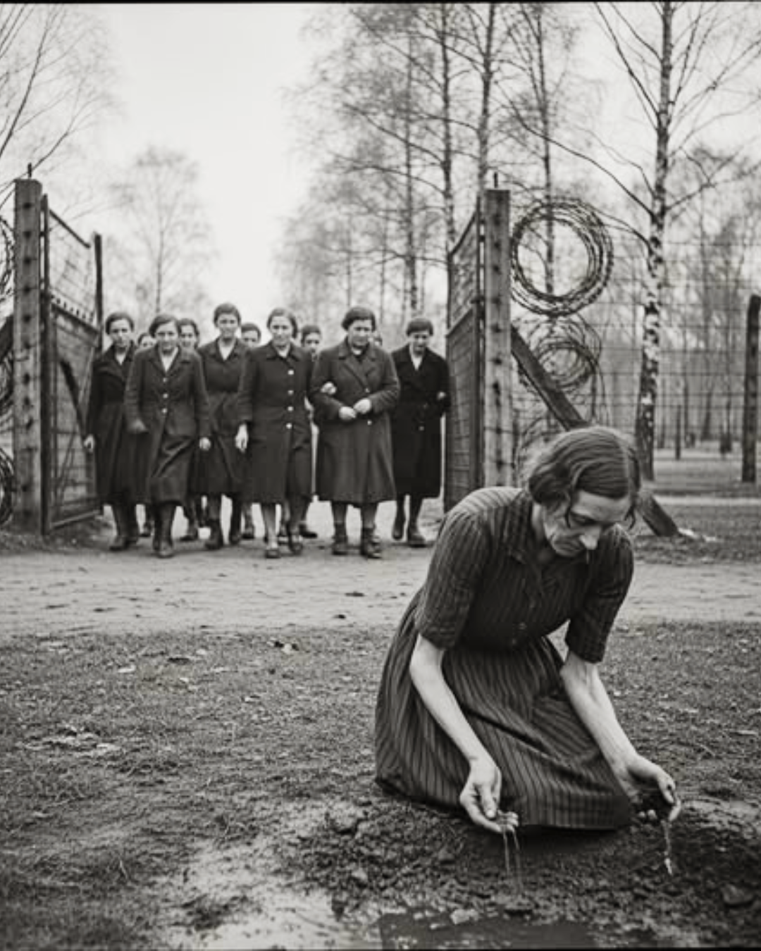 She stopped a few meters beyond the barbed wire and suddenly knelt. Her hands, emaciated, marked by forced labor, touched the earth. She took a handful of damp earth and let it flow through her fingers. There was something almost sacred about this gesture. For her, the earth was no longer just a dirty, pain-soaked surface; it was proof that a world existed beyond the barracks, beyond the guardhouse, beyond the Apelplatz. The earth was life.