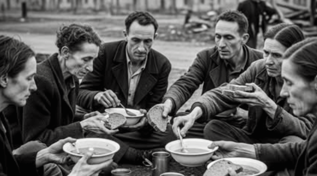 I sopravvissuti si radunarono non in preda alla frenesia, ma in un fragile ordine. Sedevano in cerchio, alcuni su panche rotte, altri a gambe incrociate sul terreno fuori dalle baracche, tra le ceneri di quella che era stata la loro prigione. Nessuna tovaglia, nessuna candela, nessun grande banchetto; solo ciotole di smalto scheggiate e cucchiai arrugginiti, passati di mano in mano. Eppure, in quei momenti, accadde qualcosa di straordinario.
