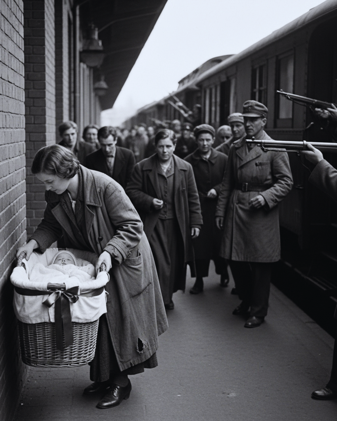 C’était une jeune mère, le visage pâle d’épuisement, mais le regard déterminé. Dans ses bras, enveloppée dans une fine couverture pour la protéger de la fraîcheur matinale, se trouvait sa petite fille. Le berceau, en osier tressé et orné d’un simple ruban bleu, était le seul bien qu’elle avait réussi à conserver. Tandis que les gardes hurlaient et que la file de déportés avançait, elle dut comprendre que le train qui la précédait ne promettait ni un nouveau logement ni un emploi, contrairement aux affirmations mensongères des Allemands. Ces wagons à bestiaux étaient des machines à mort. Les mères savent instinctivement quand le danger menace leurs enfants, et à cet instant, elle comprit : si sa petite fille montait dans ce train, il n’y aurait pas de retour possible.