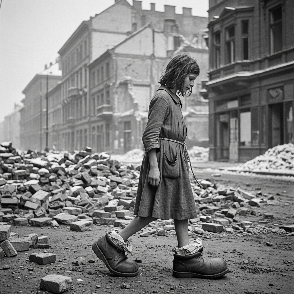 Indossava un semplice abito lacero, legato in vita con una corda. Ma ciò che catturava l’attenzione di chiunque la vedesse erano le sue scarpe: troppo grandi per i suoi piedi delicati, pesanti e goffe mentre camminava sulle macerie. Non erano le sue scarpe. Appartenevano a suo fratello, morto durante l’assedio.
