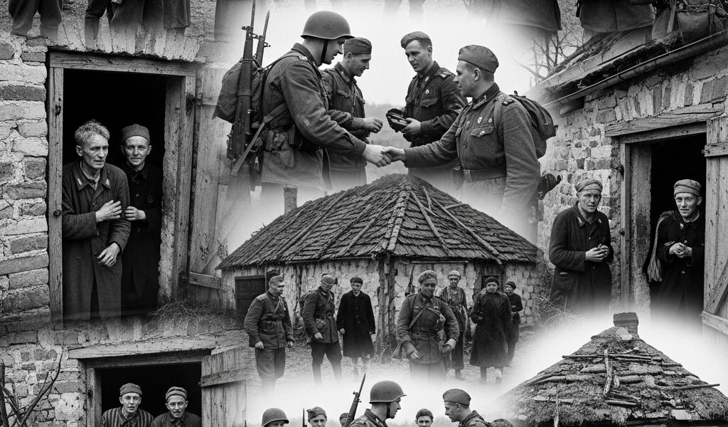 On the outskirts of a Polish village, amidst dilapidated wooden shacks, two Soviet soldiers encountered two men. They stood on the doorstep, arm in arm, emaciated, their faces sun-scorched. One of the soldiers took a piece of bread from his pocket and offered it to them with a trembling hand.
