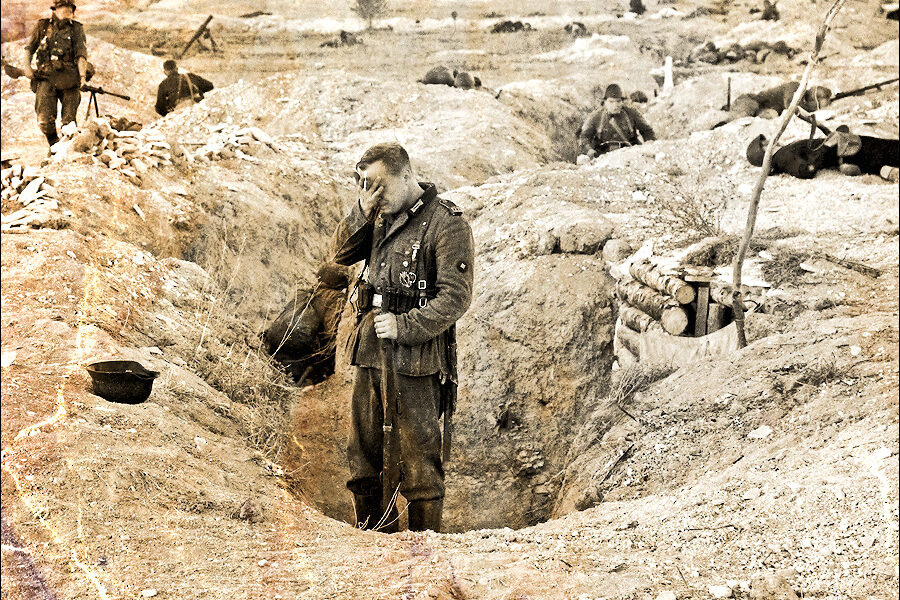 Seine Haltung – die gesenkte Schulter, die Hand über dem Gesicht – erzählt von innerem Schmerz, vielleicht von Trauer um gefallene Kameraden oder von der Sinnlosigkeit, die ihn umgibt. Der Helm liegt neben ihm im Dreck, als Symbol dafür, dass selbst die Waffen und Uniformen keine Zuflucht bieten können. Um ihn herum erstrecken sich die Schützengräben – Zeugnisse eines Stellungskriegs, der unzählige Leben verschlang und nichts als Zerstörung hinterließ.