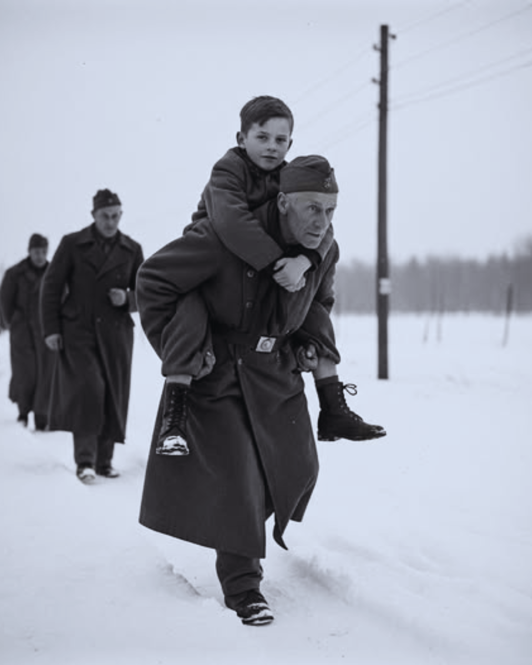 Zima tamtego roku była bezlitosna. Mróz ścinał powietrze niczym stalowy nóż, a śnieg – zamiast czystości – niósł ze sobą ciężar śmierci. Drogi pełne były śladów ludzi, których imiona zatarł czas, lecz echo ich kroków przetrwało w historii. Wśród nich był chłopiec – Leo Weiss – i mężczyzna, którego imienia nigdy nie poznano. Tylko ten obraz: starszy więzień niosący dziecko na plecach przez białe pustkowie, gdzie każdy oddech był walką o istnienie.