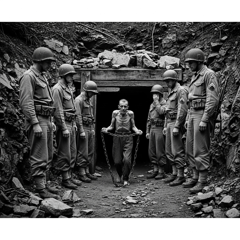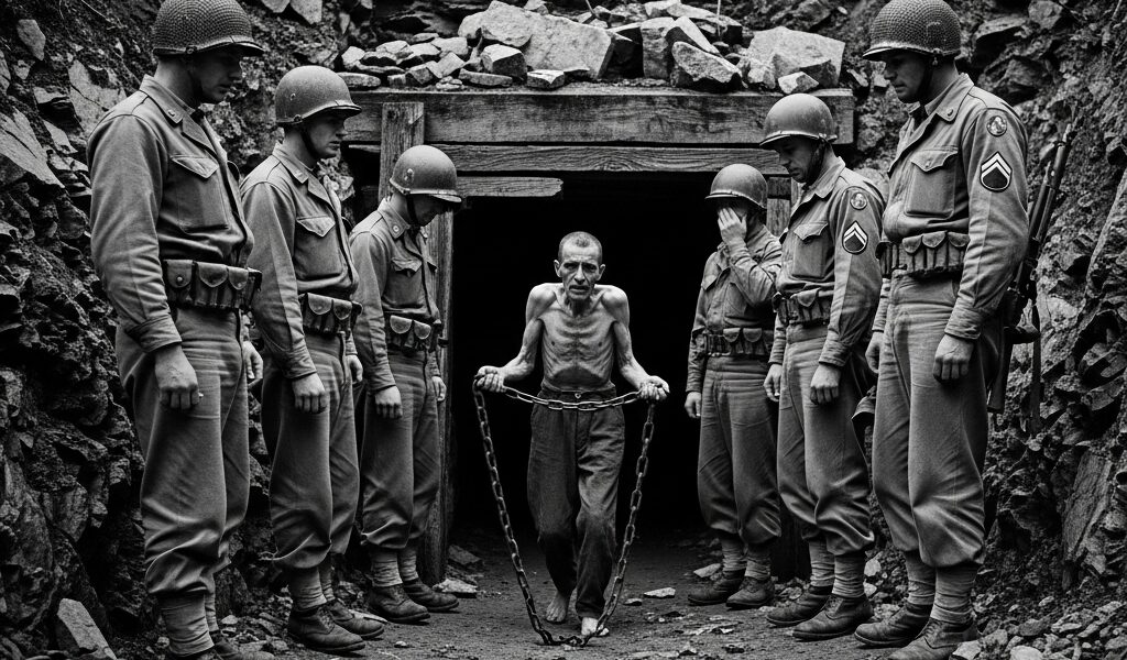 Among them was one man who seemed barely alive, his ribs exposed, his steps uncertain. He emerged from the mouth of a tunnel, dragging something behind him. At first, the American soldiers thought he was still bound. Then they saw: the chain was not attached to him at all.