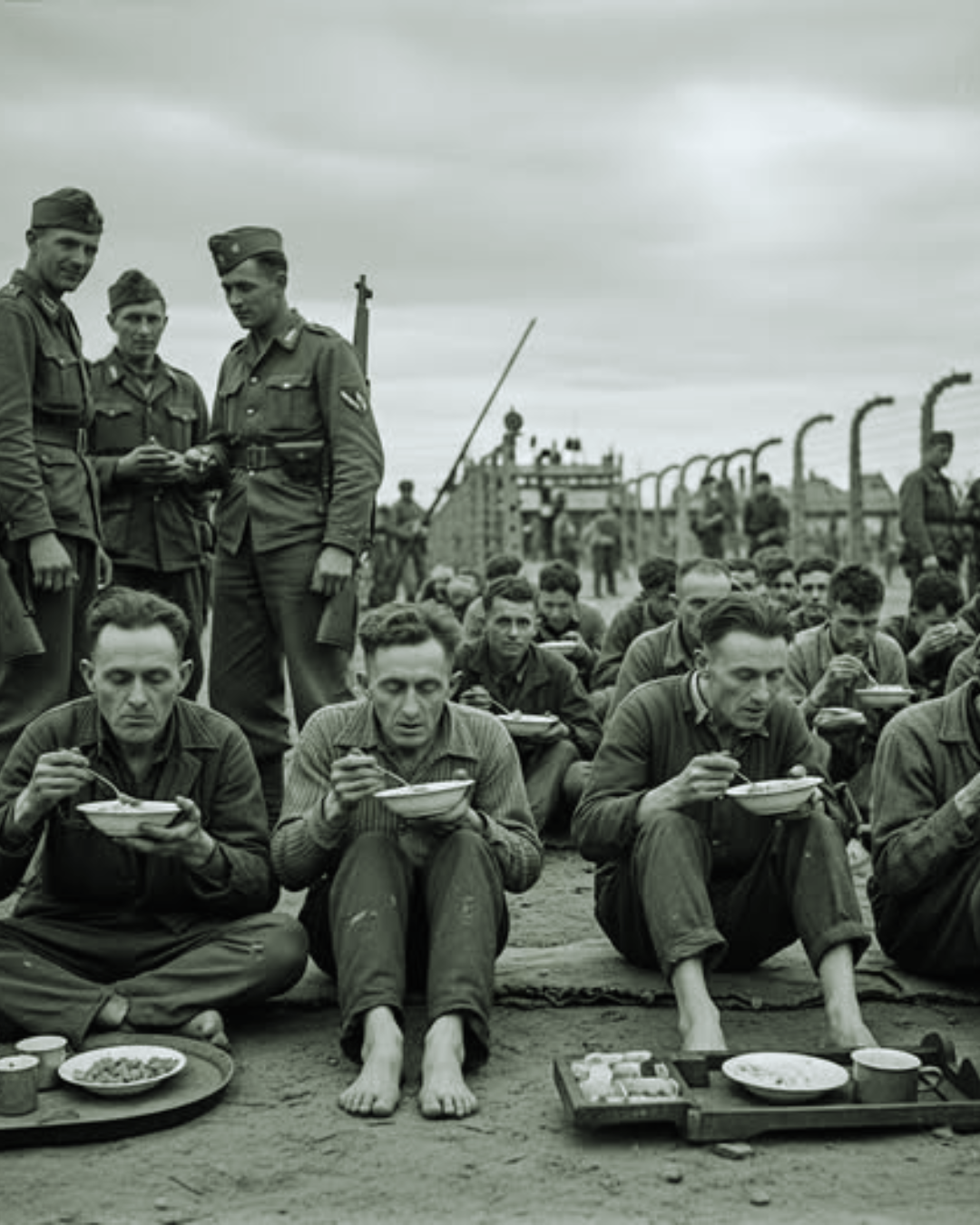 The survivors moved forward hesitantly, their steps uncertain, their bodies trembling. Their hollow eyes stared at the makeshift tables where bread, bowls of hot soup, and a few army rations lay. For these men who had learned to fear every morsel of food, the moment seemed surreal. Eating, until then, had been an experience linked to anxiety. They had to fight for crumbs, steal at the risk of death, secretly swallow soiled leftovers, fearing the return of hunger with every bite. And now, for the first time in years, they were being offered food, without threats, without humiliation, without conditions.