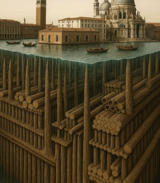 Venezia è un miracolo sospeso tra cielo e acqua, una città che non smette mai di sorprendere chi la visita e chi la studia. Fondata ufficialmente il 25 marzo del 421, quando si costruì la prima chiesa di San Giacomo sull’isola di Rialto, Venezia non si innalza su roccia o cemento ma su milioni di pali di legno piantati nelle profondità del fango della laguna. Questo straordinario sistema, frutto di ingegno e necessità, ha trasformato una palude in una delle città più affascinanti e durature al mondo. Gli alberi utilizzati, soprattutto ontani, querce e larici, provenivano dalle foreste del Nord Italia, della Slovenia e dei Balcani. Una volta immersi nell’acqua salmastra e protetti dal fango, questi tronchi non marcivano ma si indurivano, fino a diventare simili alla pietra. È così che monumenti come il Campanile di San Marco, la Basilica della Salute o il Ponte di Rialto hanno potuto reggere per secoli: il Rialto, ad esempio, poggia su circa 14.000 pali, mentre la Basilica di San Marco è sostenuta da oltre 10.000 tronchi di quercia.