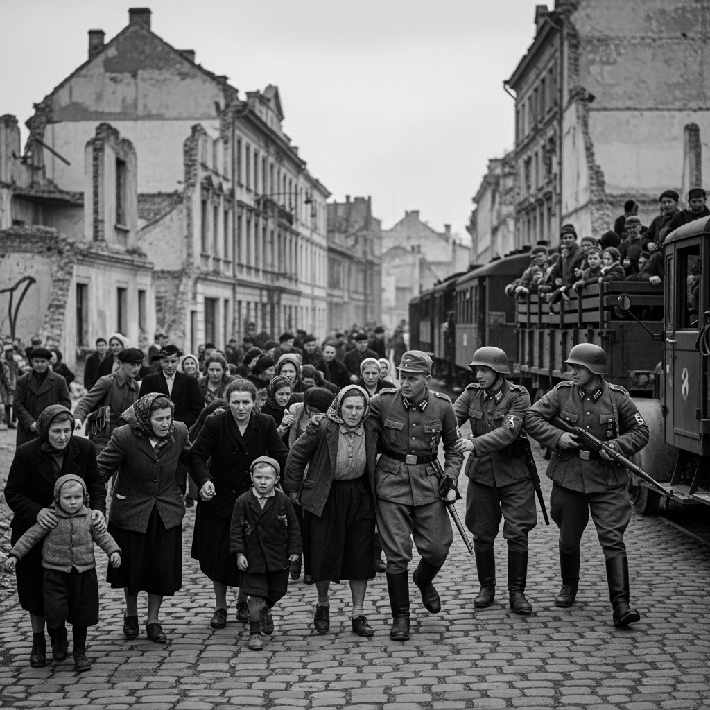 Dans les rues, on voit des familles marcher en silence, serrant des valises légères, croyant à un simple transfert vers un « nouveau quartier ». Les soldats de la Wehrmacht et les unités SS encadrent la procession, impassibles. Derrière chaque pas, une vie bascule. Les trains stationnent, noirs et froids, prêts à engloutir des centaines d’hommes, de femmes et d’enfants. La déportation devient une mécanique du quotidien. À chaque départ, un pan de Vilnius disparaît.